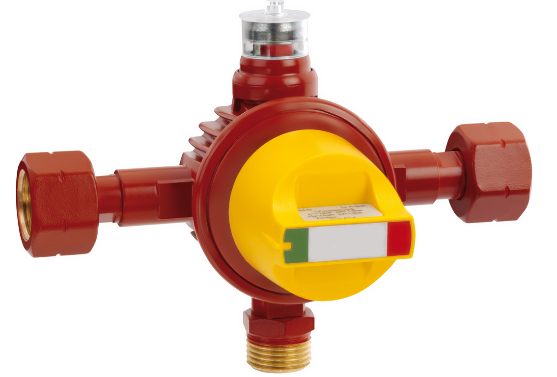 - wbudowany wydmuchowy zawór bezpieczeństwa PRV, który zapobiega uszkodzeniu odbiorników gazu, chroniąc przed działaniem wysokiego ciśnienia. Jeżeli na skutek nieprawidłowości technicznych np. oblodzenie, zanieczyszczenia lub osady gazów zostałaby przekroczona zadana wartość reduktora, wtedy nadmierne ciśnienie zostanie odprowadzone poprzez zawór bezpieczeństwa.